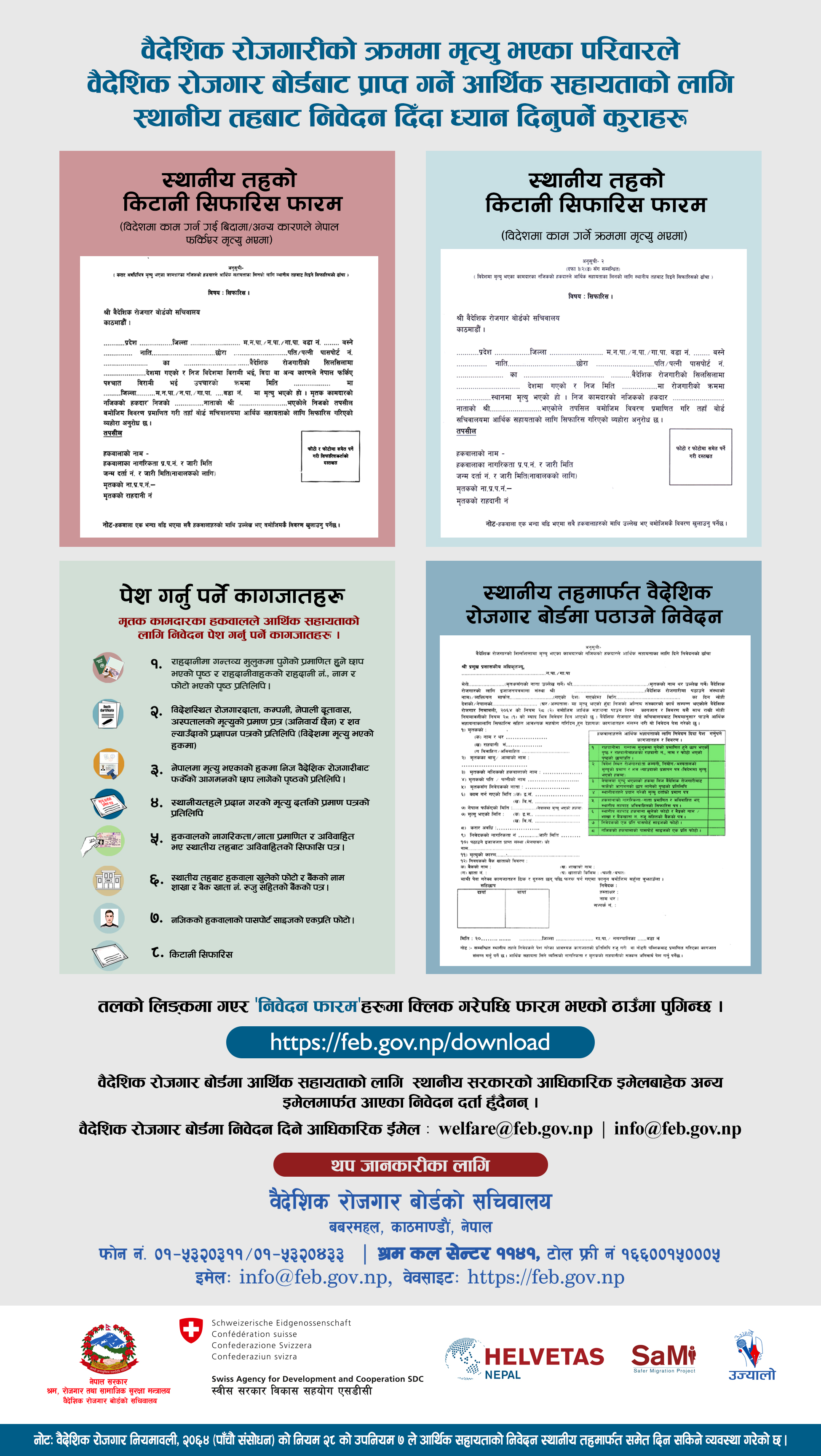 बैदेशिक रोजगारका क्रममा मृत्यु भएका वा अंग भंग भएका ब्यक्ति वा परिवारले आर्थिक सहायता पालिका बाटै लिन सक्नेDownload File